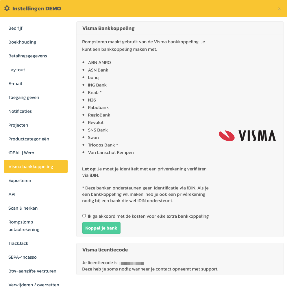 - Ga in Rompslomp naar Instellingen > Visma bankkoppeling.