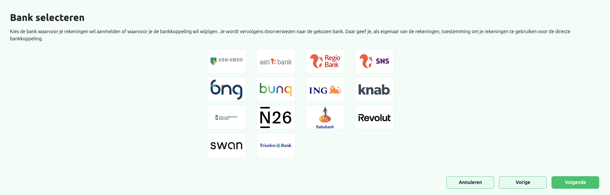 Wil je naast je bestaande bankkoppeling nóg een bank koppelen? Dan doorloop je de aanmeld stappen opnieuw voor die extra bank.