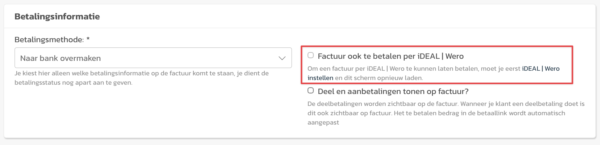 Wanneer je daarna een factuur maakt, zie je in het blok ‘Betalingsinformatie’ dat de factuur ook via iDEAL | Wero betaald kan worden.