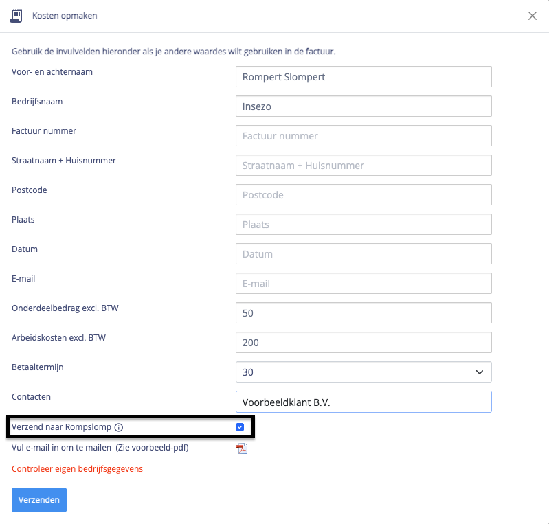 Je krijgt al een paar test werkbonnen in jouw Insezo omgeving wanneer het Insezo account is aangemaakt, met deze werkbonnen kan je de functionaliteit testen en ze doorzetten naar Rompslomp. Nieuwe werkbonnen kan je zelf aanmaken via 'Opdracht aanmaken'.